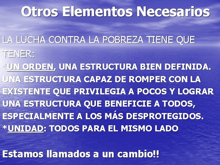 Otros Elementos Necesarios LA LUCHA CONTRA LA POBREZA TIENE QUE TENER: *UN ORDEN, UNA ESTRUCTURA BIEN DEFINIDA. UNA ESTRUCTURA CAPAZ DE ROMPER CON LA EXISTENTE QUE PRIVILEGIA A POCOS Y LOGRAR UNA ESTRUCTURA QUE BENEFICIE A TODOS, ESPECIALMENTE A LOS MÁS DESPROTEGIDOS. *UNIDAD: TODOS PARA EL MISMO LADO Estamos llamados a un cambio!!