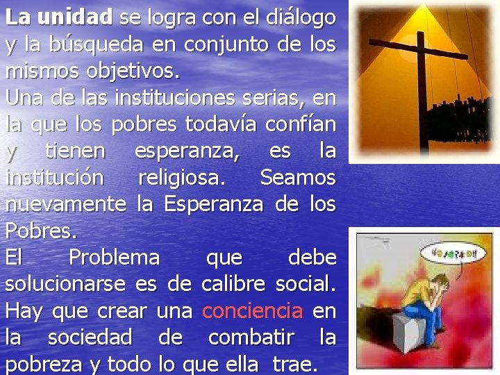 La unidad se logra con el diálogo y la búsqueda en conjunto de los mismos objetivos. Una de las instituciones serias, en la que los pobres todavía confían y tienen esperanza, es la institución religiosa. Seamos nuevamente la Esperanza de los Pobres. El Problema que debe solucionarse es de calibre social. Hay que crear una conciencia en la sociedad de combatir la pobreza y todo lo que ella trae.