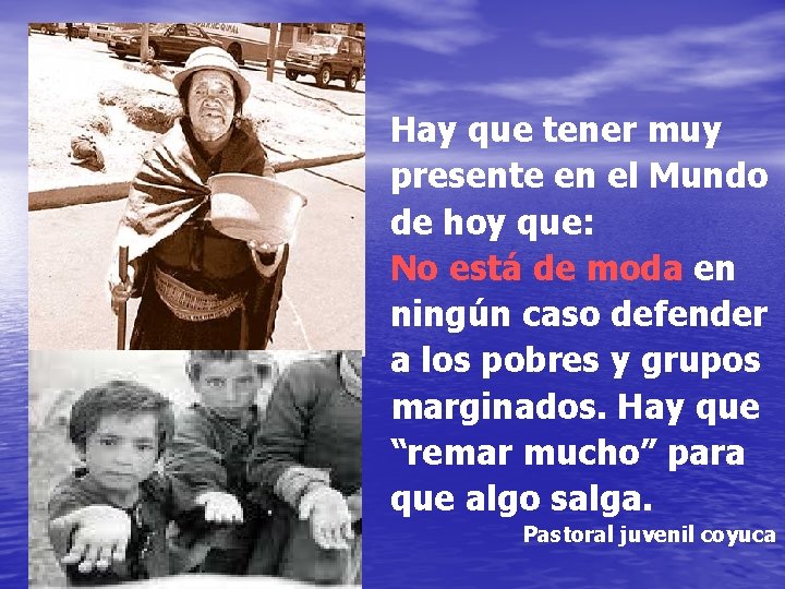 Hay que tener muy presente en el Mundo de hoy que: No está de moda en ningún caso defender a los pobres y grupos marginados. Hay que “remar mucho” para que algo salga. Pastoral juvenil coyuca