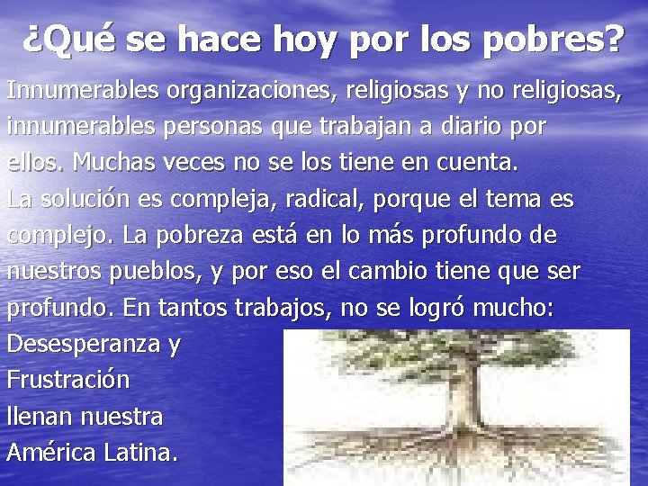¿Qué se hace hoy por los pobres? Innumerables organizaciones, religiosas y no religiosas, innumerables personas que trabajan a diario por ellos. Muchas veces no se los tiene en cuenta. La solución es compleja, radical, porque el tema es complejo. La pobreza está en lo más profundo de nuestros pueblos, y por eso el cambio tiene que ser profundo. En tantos trabajos, no se logró mucho: Desesperanza y Frustración llenan nuestra América Latina.