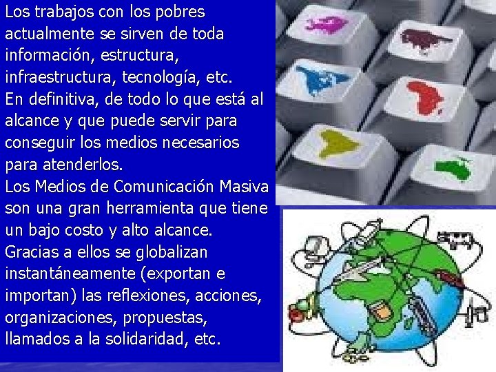 Los trabajos con los pobres actualmente se sirven de toda información, estructura, infraestructura, tecnología, etc. En definitiva, de todo lo que está al alcance y que puede servir para conseguir los medios necesarios para atenderlos. Los Medios de Comunicación Masiva son una gran herramienta que tiene un bajo costo y alto alcance. Gracias a ellos se globalizan instantáneamente (exportan e importan) las reflexiones, acciones, organizaciones, propuestas, llamados a la solidaridad, etc.