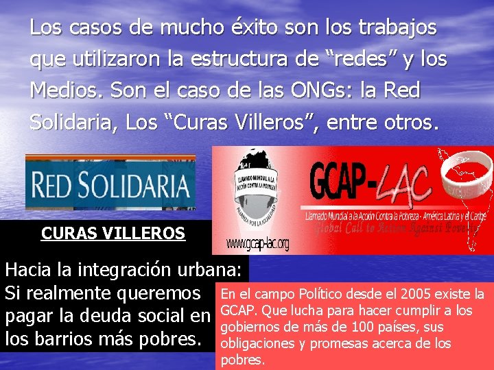 Los casos de mucho éxito son los trabajos que utilizaron la estructura de “redes” y los Medios. Son el caso de las ONGs: la Red Solidaria, Los “Curas Villeros”, entre otros. CURAS VILLEROS Hacia la integración urbana: Si realmente queremos En el campo Político desde el 2005 existe la pagar la deuda social en GCAP. Que lucha para hacer cumplir a los gobiernos de más de 100 países, sus los barrios más pobres. obligaciones y promesas acerca de los pobres.