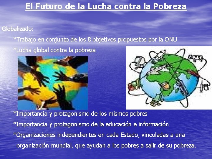 El Futuro de la Lucha contra la Pobreza Globalizado: *Trabajo en conjunto de los 8 objetivos propuestos por la ONU *Lucha global contra la pobreza *Importancia y protagonismo de los mismos pobres *Importancia y protagonismo de la educación e información *Organizaciones independientes en cada Estado, vinculadas a una organización mundial, que ayudan a los pobres a salir de su pobreza.