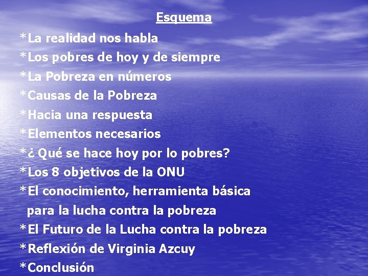Esquema *La realidad nos habla *Los pobres de hoy y de siempre *La Pobreza en números *Causas de la Pobreza *Hacia una respuesta *Elementos necesarios *¿ Qué se hace hoy por lo pobres? *Los 8 objetivos de la ONU *El conocimiento, herramienta básica para la lucha contra la pobreza *El Futuro de la Lucha contra la pobreza *Reflexión de Virginia Azcuy *Conclusión