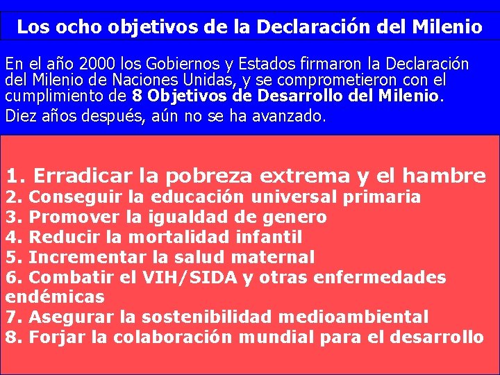 Los ocho objetivos de la Declaración del Milenio En el año 2000 los Gobiernos y Estados firmaron la Declaración del Milenio de Naciones Unidas, y se comprometieron con el cumplimiento de 8 Objetivos de Desarrollo del Milenio. Diez años después, aún no se ha avanzado. 1. Erradicar la pobreza extrema y el hambre 2. Conseguir la educación universal primaria 3. Promover la igualdad de genero 4. Reducir la mortalidad infantil 5. Incrementar la salud maternal 6. Combatir el VIH/SIDA y otras enfermedades endémicas 7. Asegurar la sostenibilidad medioambiental 8. Forjar la colaboración mundial para el desarrollo