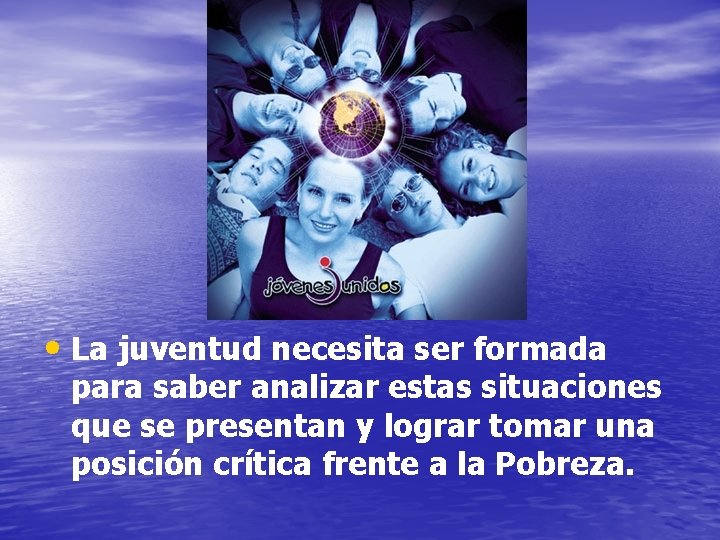 • La juventud necesita ser formada para saber analizar estas situaciones que se presentan y lograr tomar una posición crítica frente a la Pobreza.