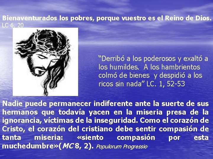 Bienaventurados los pobres, porque vuestro es el Reino de Dios. LC 6, 20 “Derribó a los poderosos y exaltó a los humildes. A los hambrientos colmó de bienes y despidió a los ricos sin nada” LC. 1, 52 -53 Nadie puede permanecer indiferente ante la suerte de sus hermanos que todavía yacen en la miseria presa de la ignorancia, víctimas de la inseguridad. Como el corazón de Cristo, el corazón del cristiano debe sentir compasión de tanta miseria: «siento compasión por esta muchedumbre» (MC 8, 2). Populorum Progressio