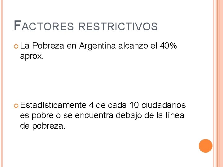 FACTORES RESTRICTIVOS La Pobreza en Argentina alcanzo el 40% aprox. Estadísticamente 4 de cada 10 ciudadanos es pobre o se encuentra debajo de la línea de pobreza.
