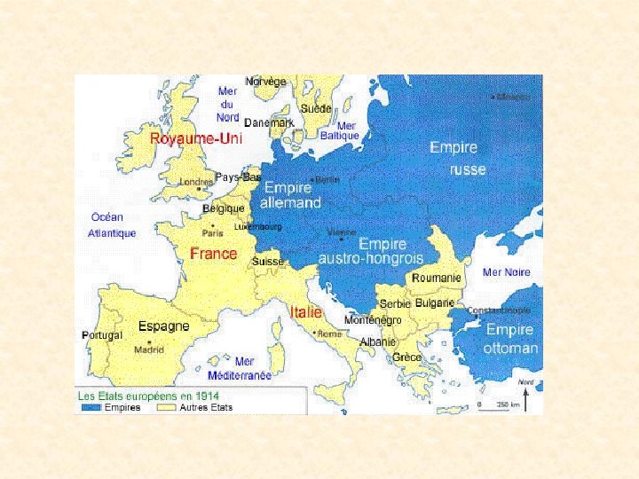 En Europe certains pays dominaient le continent Les pays démocratiques: • La France • La Grande Bretagne Les pays/empires avec des régimes autoritaires: • l’Allemagne avec le Kaiser Guillaume 2 • l’Autriche-Hongrie avec l’Empereur François-Joseph • la Russie avec le Tsar Nicolas 2