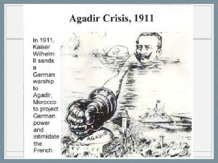 La crise marocaine (1905) -L’Allemagne n’aimait pas le nouveau rapport entre la Grande-Bretagne et la France. - Dans un effort d’affaiblir ce rapport, l’Allemagne a décidé d’attaquer la France au Maroc. - Comme partie de l’entente, la GB supportait un coup français au Maroc et la France supportait la position britannique en Égypte (le Maroc n’était pas colonisé). -- L’Allemagne a annoncé qu’elle soutiendrait le Sultan du Maroc à maintenir son indépendance. -- La conférence à Algésiras, en Espagne en 1906. Les Britanniques ont supporté les Français.