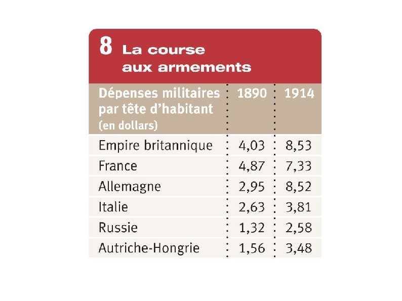 La course aux armements est le résultat logique de la peur d'une guerre européenne généralisée, succédant aux nombreuses crises qui ont eu lieu depuis 1905. Afin de faire face, les puissances européennes renforcent les effectifs de leurs armées et accélèrent la production d'armes de tous types. L'impopularité de ces mesures (service militaire plus long, plus d'impôts pour financer l'effort militaire) est combattue par la propagande des gouvernements pour les faire accepter. À l'opposé les différents partis socialistes européens tentent sans succès de mettre au point une action commune pour empêcher le déclenchement de la guerre dont les classes populaires seraient les premières victimes.