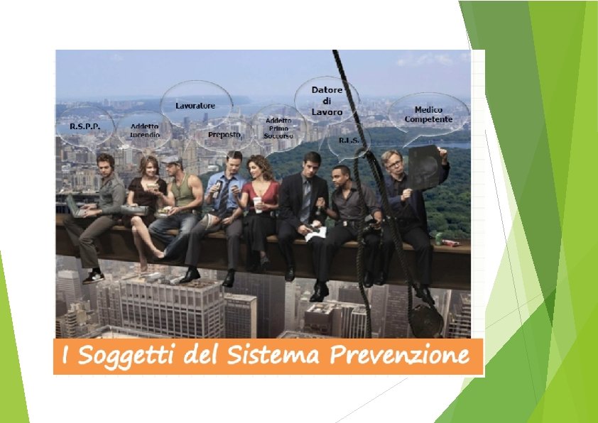 Attribuzione e Competenze (art. 2 lett. b), d), e) D. Lgs. 81 Datore di lavoro PREDISPONE: Garante strutturale Potere di decisione e di spesa Dirigente Garante del controllo organizzativo della sicurezza Compiti indelegabili: Valutazione di tutti i rischi e nomina Rspp. Vigila ATTUA : Organizza e consente l’uso sicuro di luoghi e attrezzat. può avere deleghe dal D. d. L. Preposto Garante del controllo della sicurezza VIGILA : i lavoratori sul rispetto delle leggi , norme aziendali, uso dei Dpi consente l’uso sicuro di luoghi e attrezzat. Riferisce ogni carenza di prevenzione