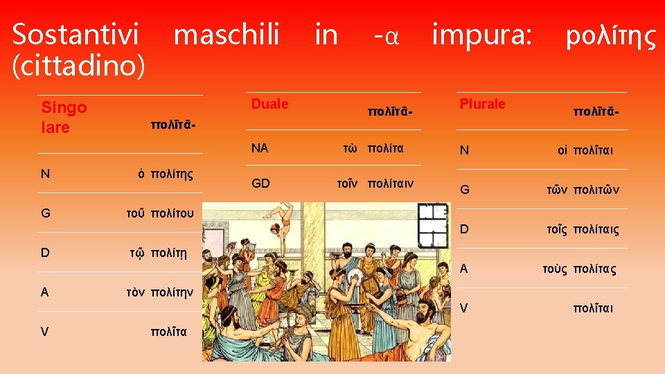 I SOSTANTIVI MASCHILI: • Nella prima declinazione i sostantivi maschili presentano sempre l’ α lungo. Si conserva nel singolare quando è PURO, mentre se è IMPURO si muta in -η. • Hanno il NOMINATIVO SINGOLARE che termina in –ς • Hanno il GENITIVO SINGOLARE che termina in –ου • Hanno il VOCATIVO in -ᾱ se il NOMINATIVO esce in –ας, in –η se il NOMINATIVO esce in -ης