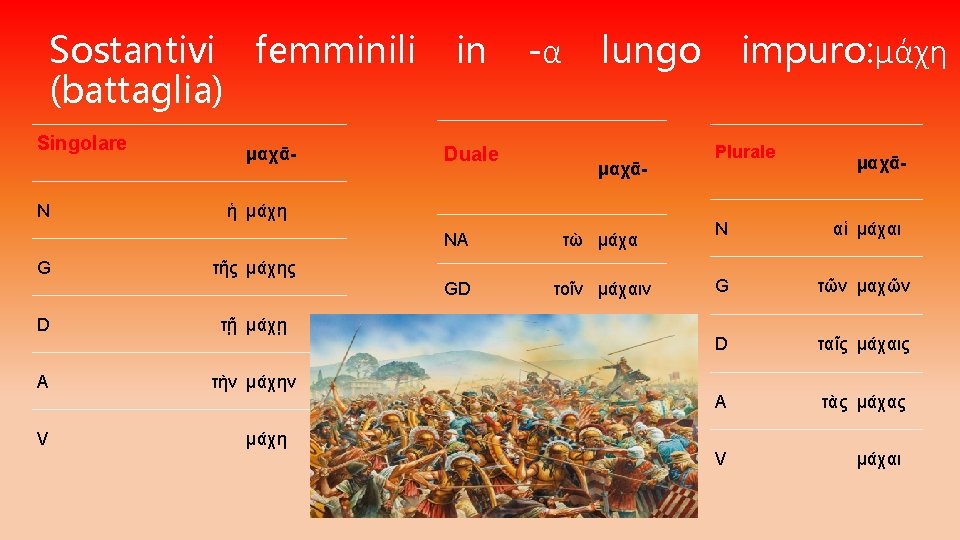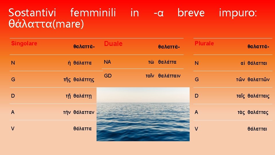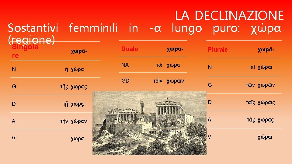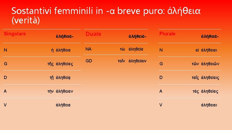 CONTINUA… I SOSTANTIVI FEMMINILI SI DIVIDONO IN: q. Temi in –α lungo: • se PURO (preceduto da ε, ι, ρ ) si mantiene in tutta la declinazione del singolare • se IMPURO (non preceduto da ε, ι, ρ ) si muta in η in tutta la declinazione del singolare q. Temi in –α breve: • se PURO si mantiene al nominativo, accusativo e vocativo singolare, mentre al genitivo e al dativo singolare si allunga α lungo • se IMPURO si allunga in η nel genitivo e nel dativo singolare