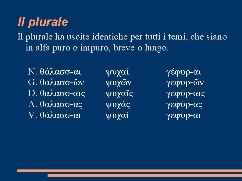 Alfa impura breve e lunga a confronto (tema θαλασσᾰ) N. θάλασσ-α G. θαλάσσ-ης D. qalavss-h/ A. qavlass-an V. qavlassa (tema ψυχᾱ) N. ψυχή G. ψυχῆς D. ψυχ-ῇ A. ψυχήν V. ψυχή