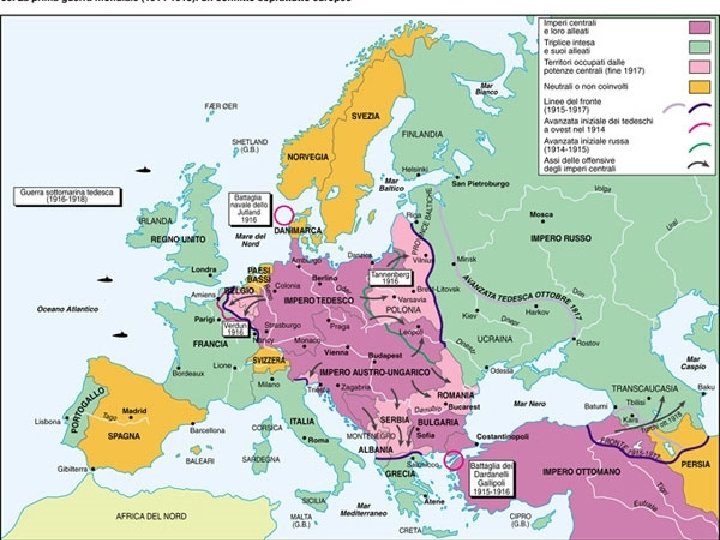 cronologia � � � � 28 Giugno 1914 un nazionalista serbo uccide l’erede al trono dell’Impero Austro-Ungarico. 28 Luglio L’ Austria dichiara guerra alla Serbia facendo scatenare il meccanismo delle alleanze Lo zar ordina la mobilitazione generale. Ultimatum della Germania alla Russia. Anche la Francia si mobilita. L’Inghilterra la segue. La Germania dichiara guerra alla Francia: 5 agosto 1914. La Germania scende in guerra, l’Italia rimane neutrale per il primo anno. L’idea generale è quella della brevità della guerra, ma questa si trasforma in una guerra di logoramento e di trincea. La Germania invade Belgio e Lussemburgo per arrivare in Francia, i francesi bloccano i tedeschi sul fiume Merna, si creano così 800 Km di trincea con truppe da una parte franco-inglesi e dall’altra austrotedeschi. cronologia