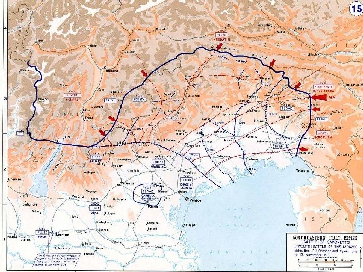 Il fronte italiano • Le truppe vennero immediatamente spostate al nord e venne definito un confine militare che correva lungo gli spartiacque • Per 2 anni e mezzo ci fu una lunga guerra di posizione con minime conquiste territoriali • Il piano di guerra italiano era ambiziosissimo e irrealizzabile