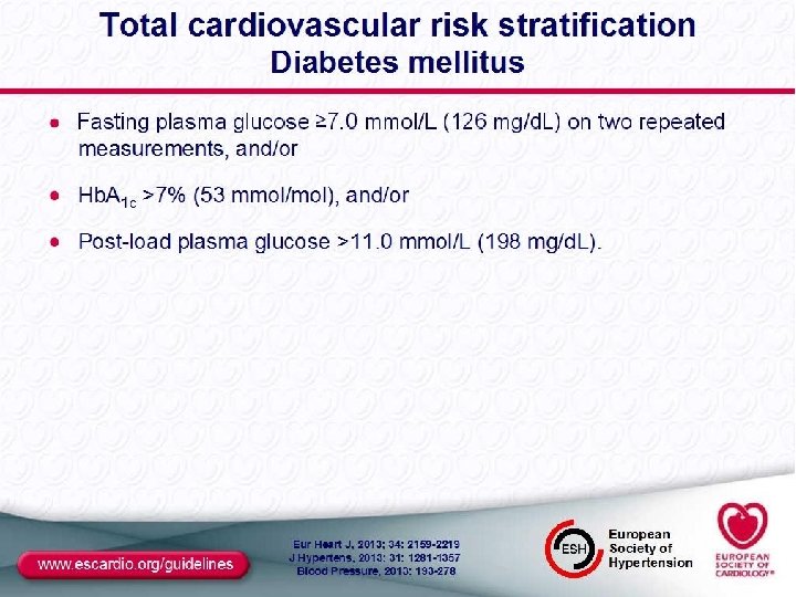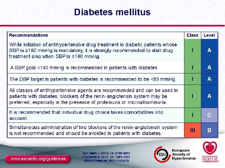 2013 ESH/ESC Guidelines for the management of arterial hypertension Hypertension treatment for people with diabetes Recommendations Additonal considerations Mandatory: initiate drug treatment in patients with SBP ≥ 160 mm. Hg • Strongly recommended: start drug treatment when SBP ≥ 140 mm. Hg SBP goals for patients with diabetes: <140 mm. Hg DBP goals for patients with diabetes: <85 mm. Hg All hypertension treatment agents are recommended and may be used in patients with diabetes • RAS blockers may be preferred • Especially in presence of preoteinuria or microalbuminuria Choice of hypertension treatment must take comorbidities into account • Avoid in patients with diabetes Coadministration of RAS blockers not recommended SBP, systolic blood pressure; DBP, diastolic blood pressure; RAS, renin–angiotensin system. The Task Force for the management of arterial hypertension of the European Society of Hypertension (ESH) and of the European Society of Cardiology (ESC) - J Hypertension 2013; 31: 1281 -1357 Medical Education & Information – for all Media, all Disciplines, from all over the World Powered by