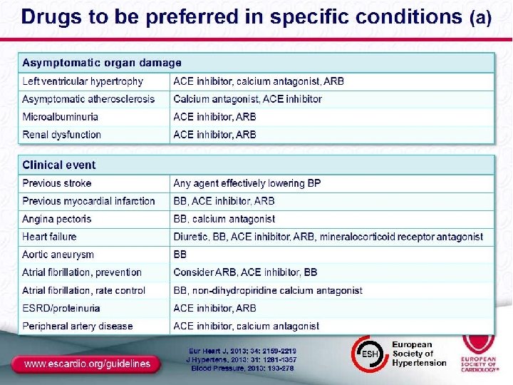 2013 ESH/ESC Guidelines for the management of arterial hypertension Hypertension treatment options Clinical scenario Recommendations Initiation and maintenance treatment Monotheray or in combination • Diuretics (thiazides, chlorthalidone, indapamide) • BBs • CCBs • ACE-I • ARBs Consider some agents as preferential choice in specific conditions due to: • Use in trials in those conditions • Great effectiveness in specific types of OD Consider two-drug combination therapy in patient with: • High baseline BP • High CV risk Combination of two RAS antagonists Not recommended Consider other drug combinations for BP reduction Most preferable option may be combinations successfully used in trial Combination therapy with fixed doses of two drugs in a single tablet May be recommended due to potential for improved adherence BB, beta-blocker; CCB, calcium channel blockers; ACE-I, angiotensin-converting-enzyme inhibitor; ARB, angiotensin receptor blocker; OD, organ damage; BP, blood pressure; CV, cardiovascular; RAS, renin–angiotensin system. The Task Force for the management of arterial hypertension of the European Society of Hypertension (ESH) and of the European Society of Cardiology (ESC) - J Hypertension 2013; 31: 1281 -1357 Medical Education & Information – for all Media, all Disciplines, from all over the World Powered by