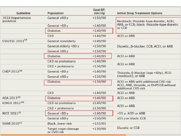Comparisons to Other Guidelines BP Goal JNC-7 JNC-8 ASH/ISH ESC/ESH CHEP Age < 60 <140/90 <140/90 Age 60 -79 <140/90 <150/90 <140/90 Age 80+ <140/90 <150/90 Diabetes <130/80 <140/90 <140/85 <130/80 CKD <130/80 <140/90 <130/90 <140/90 Adapted from Salvo M et al. Ann Pharmacother 2014; 48: 1242 -8.