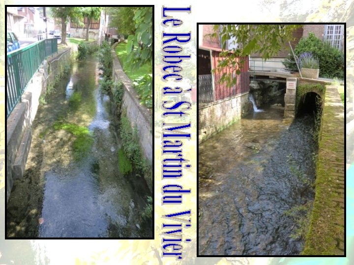 Le ROBEC long d’une dizaine de Kms prend sa source à FONTAINE sous PREAUX et est aussitôt capté pour approvisionner ROUEN en eau potable. Mais une partie de son eau continue son périple dans un petit lit en passant par St MARTIN du VIVIER et DARNETAL où il est canalisé avec des berges maçonnées pour se plier aux exigences industrielles, notamment lié au fonctionnement des moulins à aubes.