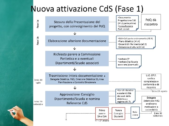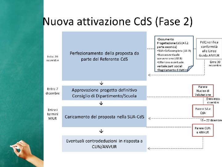 Suggerimenti del Pd. Q per la redazione del progetto di nuovo Cd. S • Importanti le indicazioni contenute nella “Guida alla scrittura degli ordinamenti didattici” del CUN e le “Linee guida per l’accreditamento iniziale dei corsi di studio di nuova attivazione” di ANVUR. • Ogni progetto dovrà affrontare due step successivi di verifica di conformità: il primo con il CUN e il secondo con ANVUR che, con il supporto di esperti disciplinari, elaborerà il protocollo di valutazione (con cui il Cd. S si accredita oppure non si accredita).