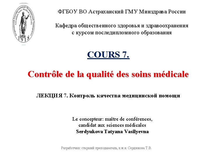 Problème de contrôle qualité pas réduit seulement évaluer la qualité des services, mais nécessite un contrôle de qualité tous les «biens» du système de santé publique. Разработчик: старший преподаватель, к. м. н. Сердюкова Т. В.