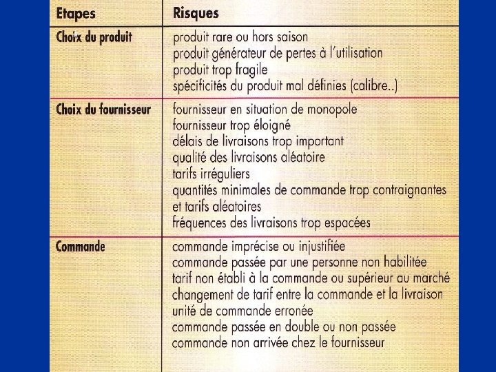 • • • • LE MATERIEL Chaussures de sécurité Vêtement chaud (Blouson…) Tenue Blouse blanche Stylo Sommelier, cutter Thermomètre Matériel Balance Gants latex Gants cuirs ( manutention…) Tampon de l’entreprise Bon de commande Comptabilité Bon de retour Bon d’avoir Cadencier…
