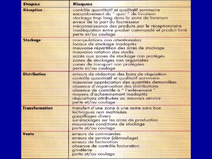 LE STOCKAGE Ordre de priorité: 1. 2. 3. 4. 5. Congelé Frais Fruits et légumes Produits secs Frais généraux • Consignes: • Respectez la méthode F. I. F. O ( First in, First out) P. E. P. S( premier entré, premier sorti) • Rangez soigneusement, soyez pratiques et ordonnés • Alignez les étiquettes face à vous • Rangez dans les locaux appropriés • Évitez la déperdition de chaud et de froid(Fermez les Chambres froides…) • Évitez de balader les produits inutilement