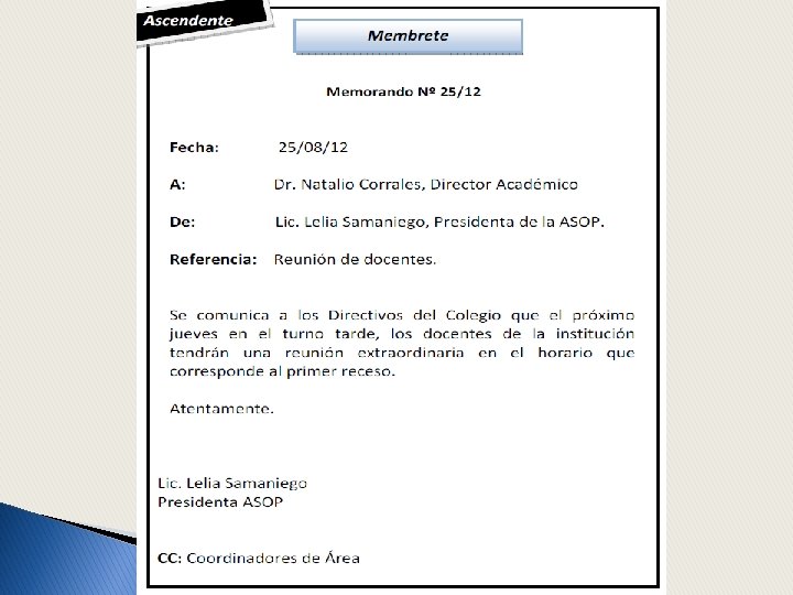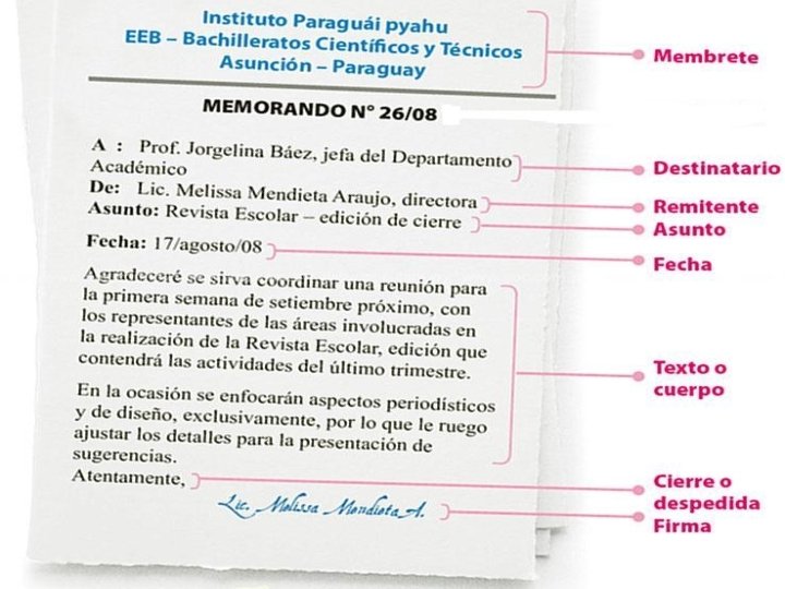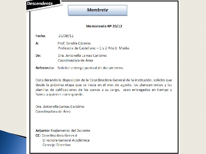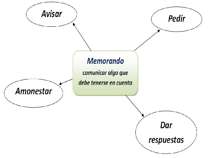 • • • Memorando /s memorándum cosa que debe recordarse. Escrito formal. Comunicación interna en la empresa. Comunicación desde un cargo superior al inferior, de uno inferior a superior, de igual a igual. Lenguaje denotativo, directo, referencial, informativo. Mensaje: claro, preciso, concreto.