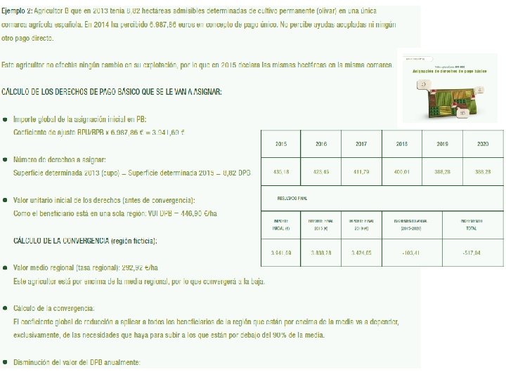 Pago básico • Es un pago desvinculado de la producción, basado en la asignación de derechos transmisibles por hectárea elegible, similar al Pago Único, aunque de importe unitario inferior, equivalente aproximadamente a algo más de la mitad del Pago Único. • Es un pago regionalizado y sujeto a convergencia con el importe medio que resulte en cada región en 2015. • Recibirán una asignación de pago básico, los agricultores activos que hayan cobrado alguna ayuda directa en 2013, por las hectáreas que soliciten en 2015, con el límite de las hectáreas con derecho a ayuda en 2013, por un importe proporcional al cobrado en la solicitud de ayuda de 2014. • Derechos transmisibles.