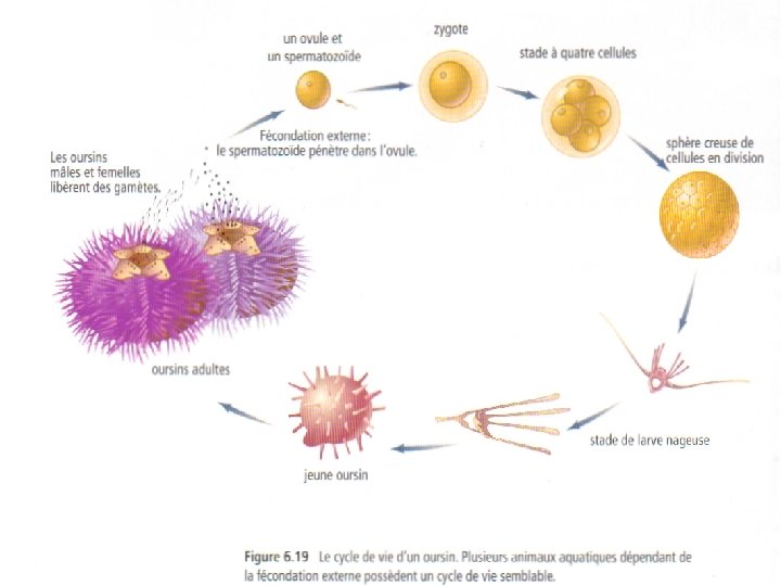 1. La fécondation externe • fécondation durant laquelle un spermatozoïde et un ovule s’unissent à l’extérieur du corps des parents • courant chez les animaux aquatiques • Ex : saumons, les oursins etc.