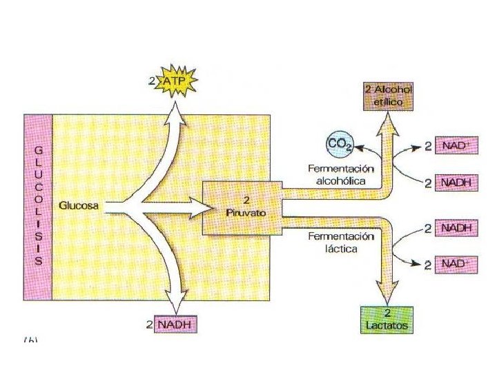Fermentación láctica n n n Este tipo de fermentación convierte el ácido pirúvico en ácido láctico. Al igual que la alcohólica, es anaeróbica y tiene una ganancia neta de 2 ATP por cada glucosa degradada. Es importante en la producción de lácteos.