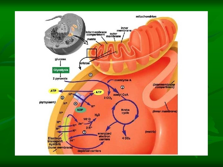 Glucólisis n n n Libera solamente el 10% de la energía disponible en la glucosa. La energía restante se libera al romperse cada molécula de ácido pirúvico en agua y bióxido de carbono. El primer paso es la conversión del ácido pirúvico (3 C) en ácido acético (2 C); el cual está unido a la coenzima A (co. A). n Se produce una molécula de CO 2 y NADH.
