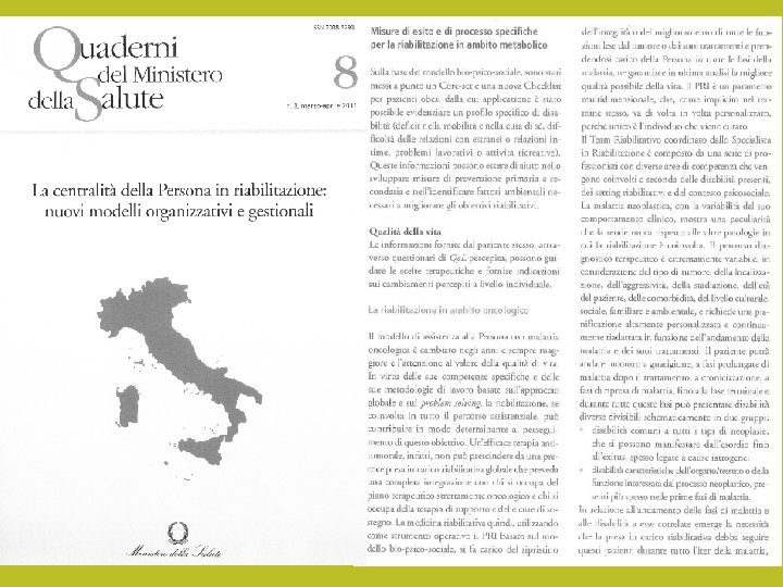 …. . RIABILITAZIONE NEL PON: LA RIABILITAZIONE IN ONCOLOGIA ASSUME UNA IMPORTANTE CONNOTAZIONE SOCIALE, IN CONSIDERAZIONE DI: - numero crescente di malati lungo sopravviventi - della cronicizzazione della malattia “La riabilitazione va intesa quindi come investimento per la società, piuttosto che come costo sociale, in quanto salvaguarda un patrimonio di esperienze umane, professionali, culturali e di potenzialità lavorativa che altrimenti andrebbe definitivamente perduto”.