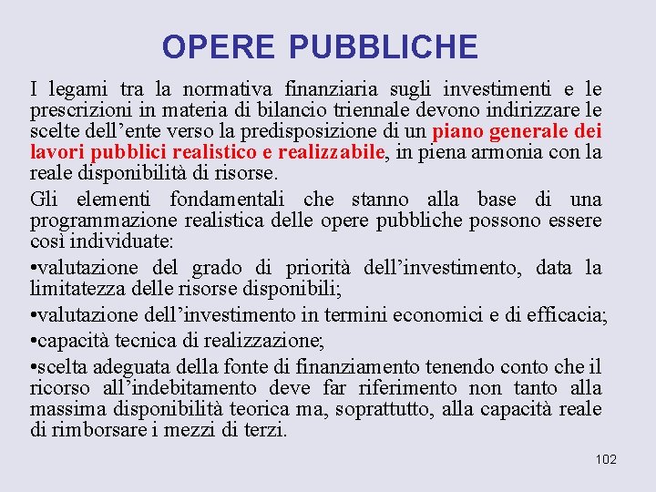 OPERE PUBBLICHE I legami tra la normativa finanziaria sugli investimenti e le prescrizioni in materia di bilancio triennale devono indirizzare le scelte dell’ente verso la predisposizione di un piano generale dei lavori pubblici realistico e realizzabile, in piena armonia con la reale disponibilità di risorse. Gli elementi fondamentali che stanno alla base di una programmazione realistica delle opere pubbliche possono essere così individuate: • valutazione del grado di priorità dell’investimento, data la limitatezza delle risorse disponibili; • valutazione dell’investimento in termini economici e di efficacia; • capacità tecnica di realizzazione; • scelta adeguata della fonte di finanziamento tenendo conto che il ricorso all’indebitamento deve far riferimento non tanto alla massima disponibilità teorica ma, soprattutto, alla capacità reale di rimborsare i mezzi di terzi. 102