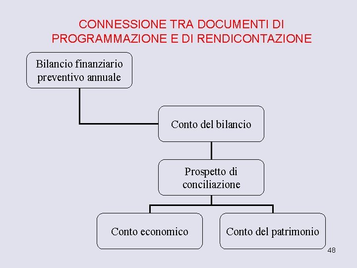 CONNESSIONE TRA DOCUMENTI DI PROGRAMMAZIONE E DI RENDICONTAZIONE Bilancio finanziario preventivo annuale Conto del bilancio Prospetto di conciliazione Conto economico Conto del patrimonio 48