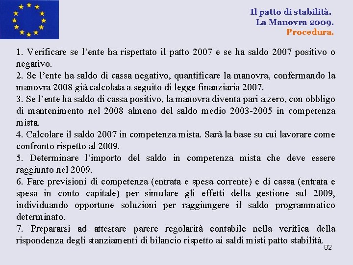 Il patto di stabilità. La Manovra 2009. Procedura. 1. Verificare se l’ente ha rispettato il patto 2007 e se ha saldo 2007 positivo o negativo. 2. Se l’ente ha saldo di cassa negativo, quantificare la manovra, confermando la manovra 2008 già calcolata a seguito di legge finanziaria 2007. 3. Se l’ente ha saldo di cassa positivo, la manovra diventa pari a zero, con obbligo di mantenimento nel 2008 almeno del saldo medio 2003 -2005 in competenza mista. 4. Calcolare il saldo 2007 in competenza mista. Sarà la base su cui lavorare come confronto rispetto al 2009. 5. Determinare l’importo del saldo in competenza mista che deve essere raggiunto nel 2009. 6. Fare previsioni di competenza (entrata e spesa corrente) e di cassa (entrata e spesa in conto capitale) per simulare gli effetti della gestione sul 2009, individuando opportune soluzioni per raggiungere il saldo programmatico determinato. 7. Prepararsi ad attestare parere regolarità contabile nella verifica della rispondenza degli stanziamenti di bilancio rispetto ai saldi misti patto stabilità. 82
