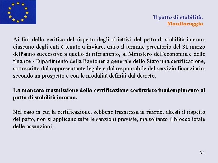 Il patto di stabilità. Monitoraggio Ai fini della verifica del rispetto degli obiettivi del patto di stabilità interno, ciascuno degli enti è tenuto a inviare, entro il termine perentorio del 31 marzo dell'anno successivo a quello di riferimento, al Ministero dell'economia e delle finanze - Dipartimento della Ragioneria generale dello Stato una certificazione, sottoscritta dal rappresentante legale e dal responsabile del servizio finanziario, secondo un prospetto e con le modalità definiti dal decreto. La mancata trasmissione della certificazione costituisce inadempimento al patto di stabilità interno. Nel caso in cui la certificazione, sebbene trasmessa in ritardo, attesti il rispetto del patto, non si applicano tutte le sanzioni previste, ma soltanto il blocco totale delle assunzioni. 91