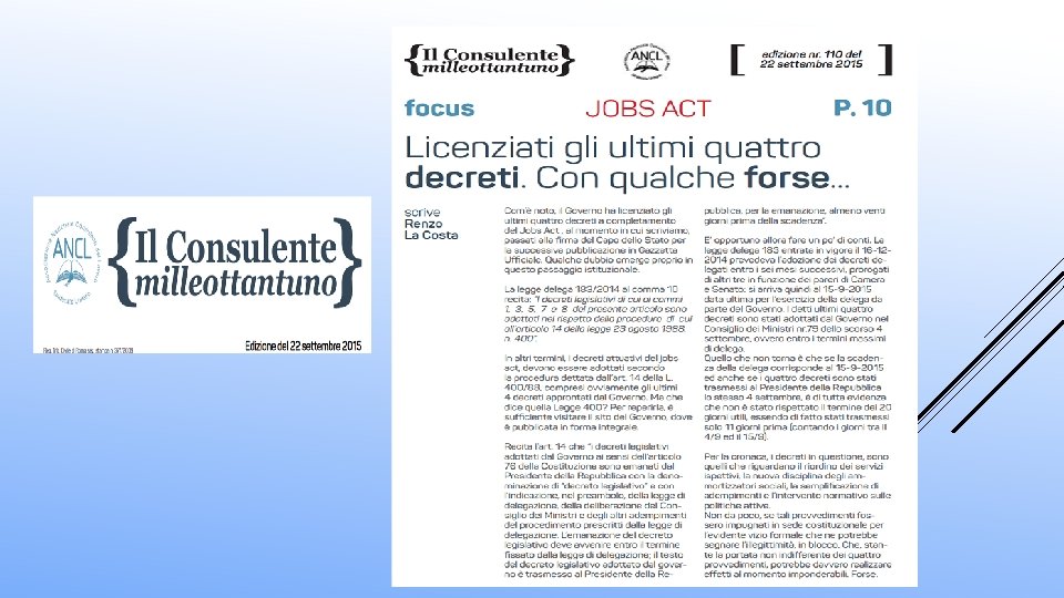 La legge delega 183/2014 al comma 10 recita: ”I decreti legislativi di cui ai commi 1, 3, 5, 7 e 8 del presente articolo sono adottati nel rispetto della procedura di cui all'articolo 14 della legge 23 agosto 1988, n. 400. ” Recita l’art. 14 che “ I decreti legislativi adottati dal Governo ai sensi dell’articolo 76 della Costituzione sono emanati dal Presidente della Repubblica con la denominazione di "decreto legislativo" e con l’indicazione, nel preambolo, della legge di delegazione, della deliberazione del Consiglio dei Ministri e degli altri adempimenti del procedimento prescritti dalla legge di delegazione. L’emanazione del decreto legislativo deve avvenire entro il termine fissato dalla legge di delegazione; il testo del decreto legislativo adottato dal governo è trasmesso al Presidente della Repubblica, per la emanazione, almeno venti giorni prima della scadenza. ” La legge delega 183 entrata in vigore il 16 -12 -2014 prevedeva l’adozione dei decreti delegati entro i sei mesi successivi, prorogati di altri tre in funzione dei pareri di Camera e Senato: si arriva quindi al 15 -9 -2015 data ultima per l’esercizio della delega da parte del Governo I detti ultimi quattro decreti sono stati adottati dal Governo nel Consiglio dei Ministri nr. 79 dello scorso 4 settembre, ovvero entro i termini massimi di delega. Quello che non torna è che se la scadenza della delega corrisponde al 15 -9 -2015 ed anche se i quattro decreti sono stati trasmessi al Presidente della Repubblica lo stesso 4 settembre, è di tutta evidenza che non è stato rispettato il termine dei 20 giorni utili, essendo di fatto stati trasmessi solo 11 giorni prima