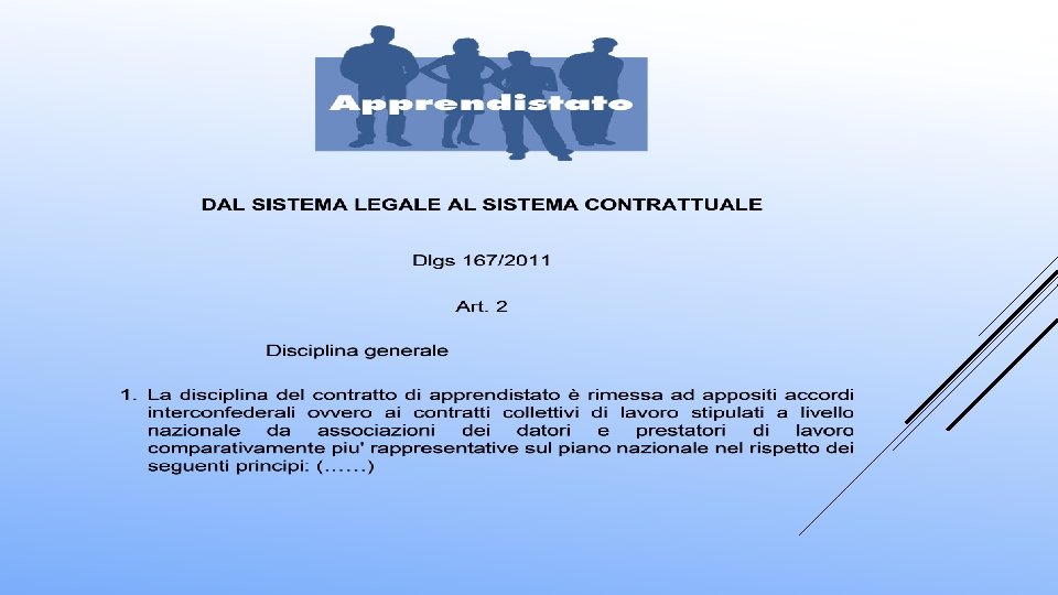 DLGS. 81/2015 – riordino tipologie contrattuali Capo V Apprendistato Art. 41 Definizione 1. L'apprendistato è un contratto di lavoro a tempo indeterminato finalizzato alla formazione e alla occupazione dei giovani Diritti e doveri dell’apprendista 40