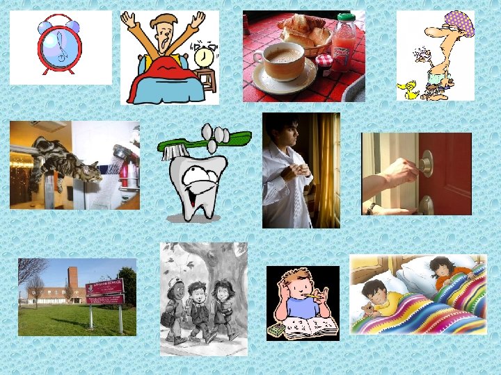 La routine quotidienne (daily routine) Je me réveille = I wake up Je me lève = I get up Je prends mon petit-déjeuner = I take my breakfast je prends une douche = I take a shower Je me lave = I get washed Je me brosse les dents = I brush my teeth Je m’habille = I get dressed Je quitte la maison = I leave the house J’arrive à l’école = I arrive at school Je rentre à la maison = I go back home Je fais mes devoirs = I do my homework Je me couche = I go to bed
