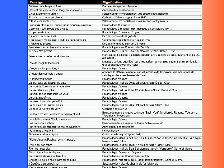 Chaque message était communiquée sous la forme de message personnels, chaque message qui de première apparences semblaient n’avoir aucune logique avaient pour un groupe de résistance une signification précise.