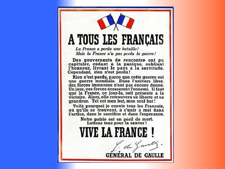 Le Général De Gaulle Le 5 juin, Paul Reynaud le fait entrer au gouvernement comme sous-secrétaire à la Défense et à la Guerre alors qu'il vient d'être promu général. Le 17 juin, à l'annonce de l'armistice, l'honneur lui commande de désobéir; il s'envole pour Londres où, dès le lendemain, sa voix devient celle de la Résistance.
