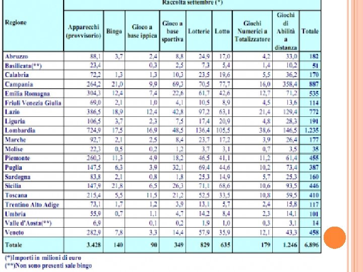 L’Amministrazione Autonoma dei Monopoli di Stato ha diffuso i dati riguardanti la raccolta giochi d’azzardo nel mese di settembre 2011. Interessante la tabella che vi riportiamo, che mostra la distribuzione geografica per regioni dei giocatori italiani.