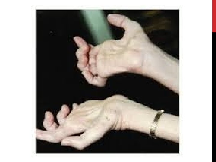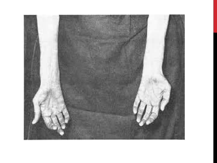 o o o 1 - forme à début brachial représente 40% Les crampes peuvent inaugurer la maladie L’Amyotrophie, les fasciculations et le déficit : débutent aux niveau des mains de façon asymétrique et réalisent la main d’Aran Duchenne (fonte des muscles des éminences thénar, hypothénar et des interosseux le pouce se place sur le même plan que les autres doigts) extension progressive en quelques semaines ou mois aux muscles proximaux des membres supérieurs et aux muscles des membres inférieurs