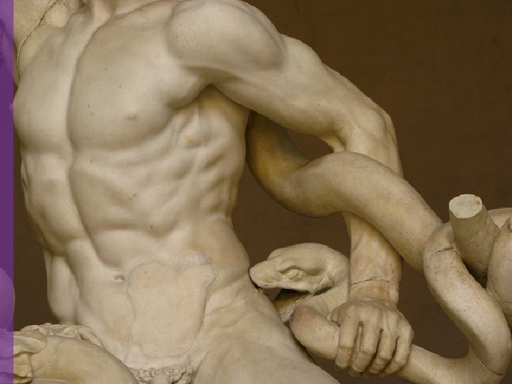 Laocoonte Il gruppo è costiuto da una rigorosa simmetria: - verticale: alla figura del padre e dei figli corrispondono i tre mantelli che cadono al centro e ai lato della composizione - orizzontale: le spire dei serpenti che si snodano in direzioni opposte Le statue sono disposte lungo una diagonale che dal braccio alzato di Laocoonte scende attraverso il torso e la gamba.