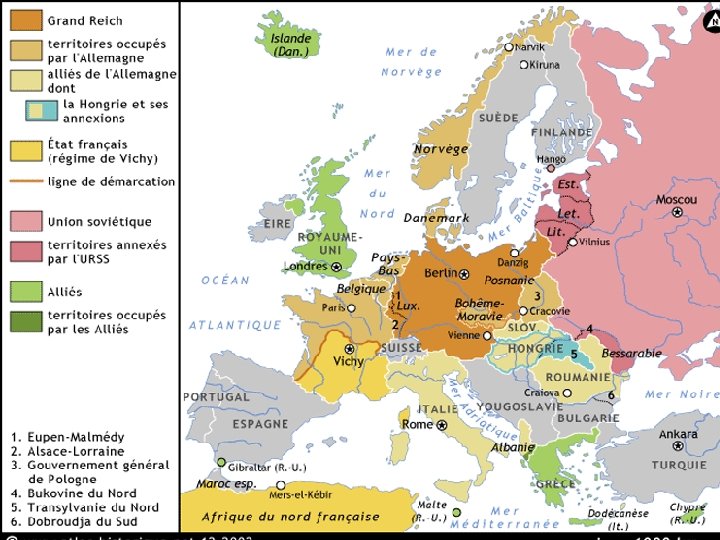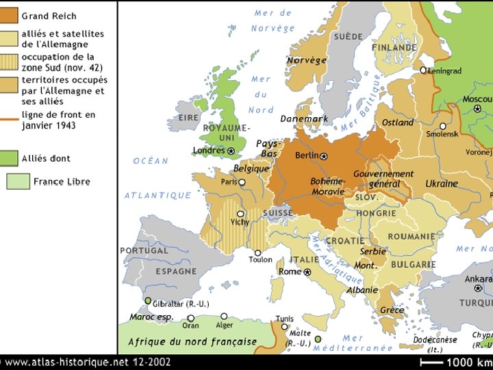 LA SECONDE GUERRE MONDIALE LIMPORTANCE DU JOUR J Slides: 20 Download presentation LA SECONDE GUERRE MONDIALE L’IMPORTANCE DU JOUR J Au printemps 1940 les Allemands ont envahi la Norvège, le Danemark, les Pays-Bas, la Belgique et la France La France a été divisée en deux zones le nord était occupé mais le sud, avec sa capitale à Vichy, est resté “zone libre” L’Europe de l’Ouest était presque tout sous le contrôle allemand En 1941 Hitler a décidé d’envahir l’Union Soviétique - ce qui était une grosse erreur Hitler a mal jugé la situation et après de longues et terribles batailles Russes ont commencé à repousser les Allemands et libérer l’Europe de l’Est Les alliés - les Britanniques, les Américains et les Canadiens - ont commencé à planifier la libération de l’Europe occidentale Les alliés ont fait semblant d’envahir la France vers Calais Mais ils ont choisi les plages de Normandie pour OPERATION OVERLORD C’était un énorme succès malgré beaucoup de sacrifices Quatre jours plus tard, le 10 juin 1944, dans la petite ville d’Oradour sur Glane, des membres des SS ont massacré toute la population. Le 25 août Paris a été libéré Les alliés ont libéré toute la France, la Belgique, les Pays Bas et se sont avancés en Allemagne jusqu’à Berlin. Ils ont aussi libéré les camps Les alliés sont arrivés à Berlin de l’ouest et les Soviétiques de l’Est La seconde guerre était finie. Maintenant la Guerre Froide a commencé.