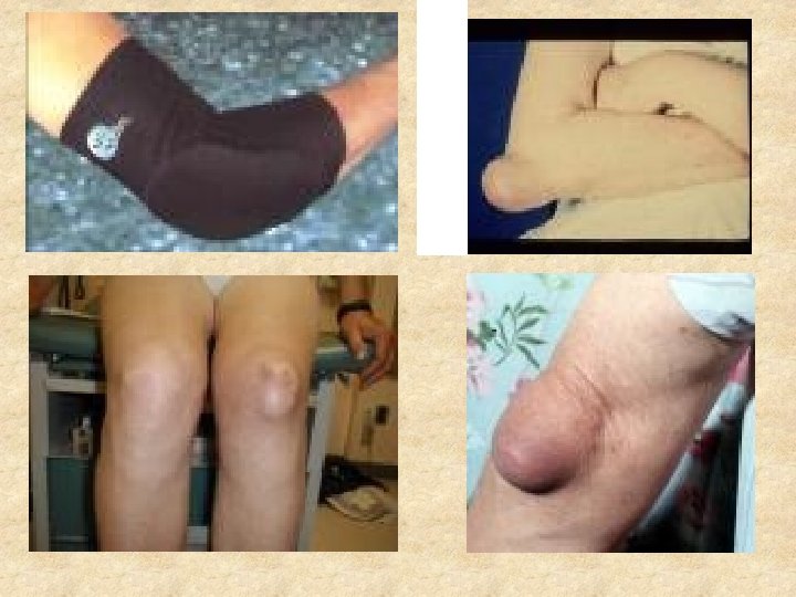 BURSITIS INFLAMACIÓN AGUDA O CRÓNICA DE LAS BOLSAS EXISTENTES EN LAS ARTICULACIONES. CAUSAS: ROCES EXCESIVOS, APOYOS PROLONGADOS, PRESIÓN CONTINUA, TRAUMATISMOS REPETIDOS. PREVENCIÓN: EVITAR ROCES, GOLPES Y APOYOS. TRATAMIENTO: INFILTRACIONES DE ANTIINFLAMATORIOS, CIRUGÍA.