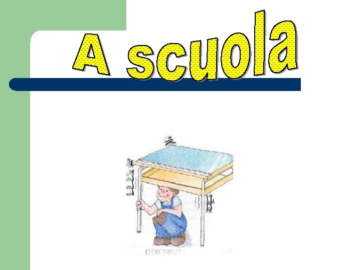 A cosa bisogna stare attenti l -FINESTRE E SUPERFICI VETRATE: presta attenzione al tuo comportamento quando sei in prossimità di superfici vetrate, dalle l finestre non gettare mai nulla e non sporgerti davanzali. l SCALE: le scale possono rivelarsi un luogo particolarmente l insidioso specie se percorse di corsa, non protenderti mai dalle ringhiere. l Non sostare nei vani delle scale durante gli intervalli. l ASCENSORI: sono riservati al personale scolastico e ai soli l disabili accompagnati dal personale ausiliario. -ARREDI E ATTREZZATURE: attenzione perché banchi, l seggiole, termosifoni ecc. possono presentare spigoli vivi che risultano l pericolosi se urtati violentemente. Ove siano presenti le tende oscuranti l del tipo pesante ed i vasistas, fai particolare attenzione l usandoli correttamente, se forzi i meccanismi e si staccano dal muro o dagli infissi l ti possono colpire e ferire. Segnala immediatamente al tuo insegnante l qualsiasi difetto o inconveniente. Ricorda che gli spintoni in prossimità l degli attaccapanni possono causare ferite. l -POSTURA - SCOLIOSI: ti potrà sembrare più comodo stare l seduto con la schiena piegata o ingobbita, ma per il bene della tua spina l dorsale e per migliorare la concentrazione, sforzati di stare con la l schiena ben diritta e appoggiata allo schienale evitando di dondolarti l sulla sedia. l -COMPUTER: evita di stare troppo inclinato verso lo schermo, ma l posizionati a circa 50 -70 cm di l distanza. Regola la sedia in modo l che lo schermo risulti un po’ più in l basso dell’altezza dei tuoi occhi. l Durante la digitazione tieni, se l possibile, mani e avambracci l appoggiati al tavolo, anche i piedi l devono essere ben appoggiati a terra. E’ tuo diritto effettuare una pausa l dopo un uso prolungato del videoterminale. l
